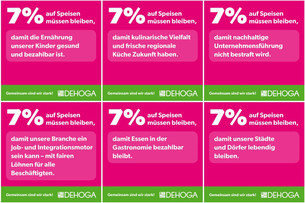 Veröffentlichen auch Sie Postings auf Ihren eignen Kanälen und markieren uns in Ihren Beiträgen. Verwenden Sie dabei folgende Hashtags: #7ProzentaufSpeisen #7Prozent #Mehrwertsteuer #Restaurants #Gastronomie #Politik #DEHOGA #DEHOGABayern