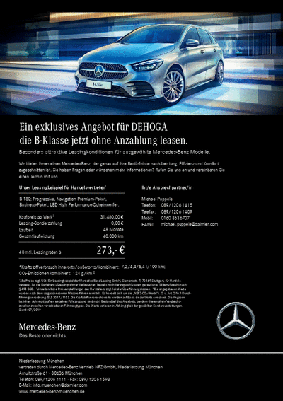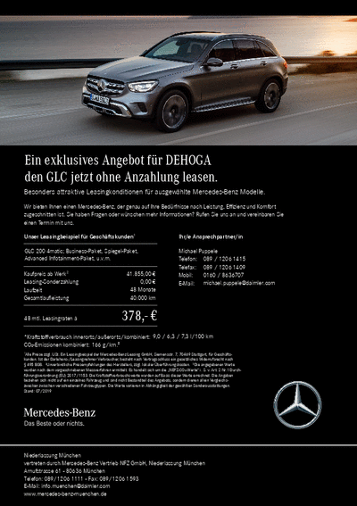 Aktuell bieten Ihnen die bayerischen Niederlassungen von Mercedes-Benz Leasingkonditionen für den GLC und die B-Klasse ohne Anzahlung an. Sollten Sie sich für ein Angebot interessieren, stehen Ihnen Ihre Ansprechpartner in München, Nürnberg und Augsburg unter folgenden Kontaktdaten zur Verfügung.