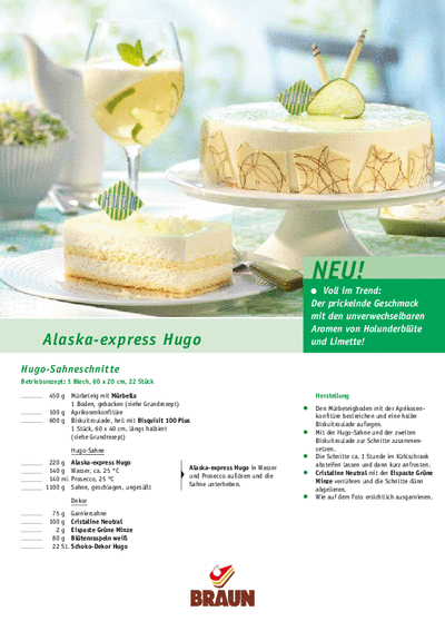 Mit der Dessertbasis AE Hugo können Sie viele kreative und erfrischende Dessertvariationen und auch einfach herstellbare Torten zaubern, die gerade jetzt im Sommer eine erfrischende Alternative zu den Klassikern bieten.