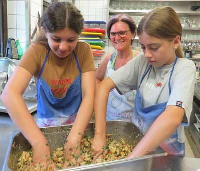 Florian Mascarello, Geschäftsführer und Kreisvorsitzender des Deutschen Hotel- und Gaststättenverbands (DEHOGA) begrüßte die teilnehmenden Schüler und deren Lehrkräfte Elisabeth Poeplau sowie Bettina Kriegbaum von der Clermont-Ferrand-Mittelschule Regensburg. Mit Kochschürzen, Tatendrang und vielen Fragen standen die Siebtklässler bereit, um aktiv an der Speisenproduktion teilzunehmen. Zu Beginn des Kochvormittags erklärte Mascarello den Schülern die wichtigsten Grundlagen zur Lebensmittel- und Personalhygiene sowie zur Arbeitssicherheit in der Gastronomie. Er beantwortete die Fragen der Jugendlichen, erzählte ihnen mit Begeisterung von seinem Beruf und stellte ihnen die Ausbildung zum Koch/Köchin vor. „Das wichtigste am Beruf Koch ist die Sorgfalt und Liebe zu den Lebensmitteln“, betonte Mascarello. Nachdem die Schüler ihre Hände gewaschen und desinfiziert hatten, ging es weiter in die Küche des Restaurants. Unter der Verwendung regionaler Lebensmittel bereitete die Klasse gemeinsam mit dem gelernten Koch und Hotelfachmann Böfflamott mit Brezenknödel zu. Bevor Mascarello zeigte was zu tun war, erklärte er Herkunft und Geschichte des traditionellen Schmorbratens. Während der Praxisstunden drehte sich alles um die aktive Zubereitung vor Ort. Die Schüler waren fleißig damit beschäftigt, die Zwiebeln, Petersilie und Brezen für die Knödel zu schneiden und das Mirepoix für das Böfflamott vorzubereiten. Alle Aufgaben wurden von den Schülern mit Bravour gemeistert, was die betreuenden Lehrkräfte sehr stolz machte. Am Ende wurden die fertigen Serviettenknödel und der deftige Braten angerichtet und im Restaurant serviert. Durch die Produktion vor Ort konnten die Schüler die Lebensmittel mit allen Sinnen begreifen und sich das typisch bayerische Gericht schmecken lassen.