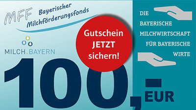 Als Zeichen des Zusammenhalts unterstützen der MFF und milch.bayern e.V. die Gastronomie mit einer Gutschein-Aktion. Insgesamt 11.000 Gutscheine im Wert von je 100 Euro liegen abrufbereit: das ist ein Gesamtwert von 1,1 Millionen Euro.