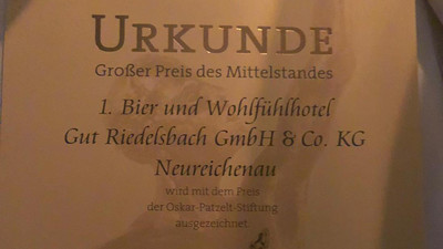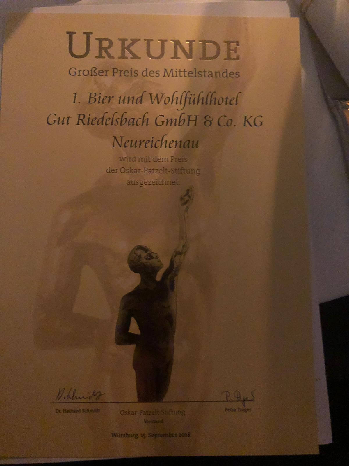 Der Preis wird von der Oskar-Patzelt-Stiftung ausgelobt und findet jedes Jahr statt. Zum 1. Mal hat das Gastgewerbe in Bayern diesen Preis abgeräumt und zwar hat diese hervorragende Auszeichnung das 1. Bier- und Wohlfühlhotel Gut Riedelsbach, der Familie Sitter erhalten. Herr Sitter war mit seinem Betrieb schon 8 Mal nominiert und letztes Jahr unter den Finallisten und ist heuer der Preisträger.