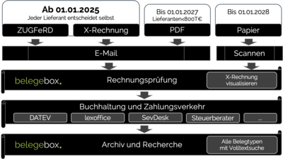 - Ab 1.Januar 2025: Stellen Sie sich darauf ein, vereinzelt E-Rechnungen per E-Mail zu erhalten. Diese Belege dürfen nicht mehr gedruckt in die Buchhaltung oder zum Steuerberater.