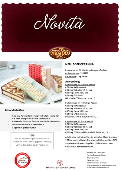 Sofficepanna ist ein Pulverprodukt für die Zubereitung von Eis, Eis-Sandwiches, Parfaits und sogar Eistorten und das alles ganz ohne Eismaschine. Einfach Sofficepanna mit Milch und Sahne verrühren, auf höchster Stufe aufschlagen und nach Belieben aromatisieren. Verwöhnen Sie Ihre Gäste mit einem leckeren Eis zum Dessert.
