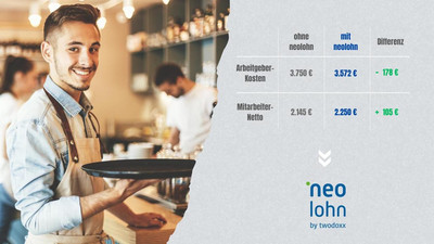 Mit Neolohn können Gastronomen und Hoteliers gleichbleibende und höhere Netto-Stundenlöhne garantieren und gleichzeitig ihre Lohnnebenkosten reduzieren. Individuelle Optimierungspotenziale können mit Hilfe von Probeabrechnungen genau kalkuliert werden. Vereinbaren Sie hierzu einen 15-minütigen Mehrwert-Check.