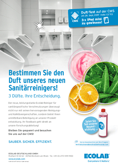 Besuchen Sie Ecolab auf der CMS in Berlin und erleben Sie kinderleichte Sauberkeit und Reinigungsvielfalt live vor Ort. Alle Messebesucher haben zusätzlich die Möglichkeit an dem Duft-Test für Ecolab's neuen Sanitärreiniger teilzunehmen. Seien Sie gespannt!