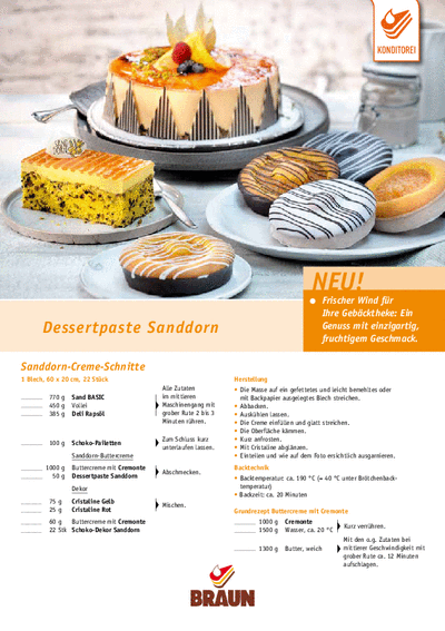 Mit der neuen Dessertpaste Sanddorn können Sie Desserts, Speiseeis oder auch fruchtige Sahnetorten kreieren und geschmacklich neue Akzente setzen. Sprechen Sie unsere Fachberater an und lassen Sie sich von den vielfältigen Ideen inspirieren, die dieser Geschmack bietet.