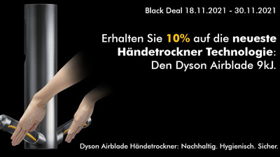 Nutzen Sie den ersten Dyson Black Deal für Geschäftskunden und erhalten Sie nur noch heute (30. November) 10 Prozent auf die neuesten Dyson Airblade 9kJ Händetrockner.*