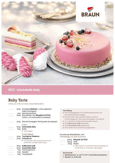 Bringen Sie Farbe ins Spiel. Braun erweitert die Schokobella-Range um die Sorte Schokobella Ruby. Das neue Produkt ist sowohl zum Füllen als auch zum Garnieren und Überziehen von Gebäcken konzipiert, was ein breites Anwendungsspektrum eröffnet. Die neue Creme bringt das markante, farbenfrohe Rosa ins Gebäcksortiment und bietet einen feinfruchtigen Geschmack. Schokobella Ruby wird direkt aus dem Eimer verarbeitet. Ein weiterer Pluspunkt ist, dass ein Gebäcküberzug mit Schokobella Ruby beim Schneiden nicht bricht. Anregungen für aktuelle Gebäckideen und diverse Anwendungsmöglichkeiten gibt ein neues Rezept.