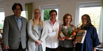 (links Günther Elfert (Geschäftsführer), Anna-Lena Schmidt (Assistentin), Bezirksvorsitzende Andrea Luger, Renate Wölfel (ehemalige Assistentin) und Frau Pilarzyk (Kreisvorsitzende Cobrug I Kassierin)