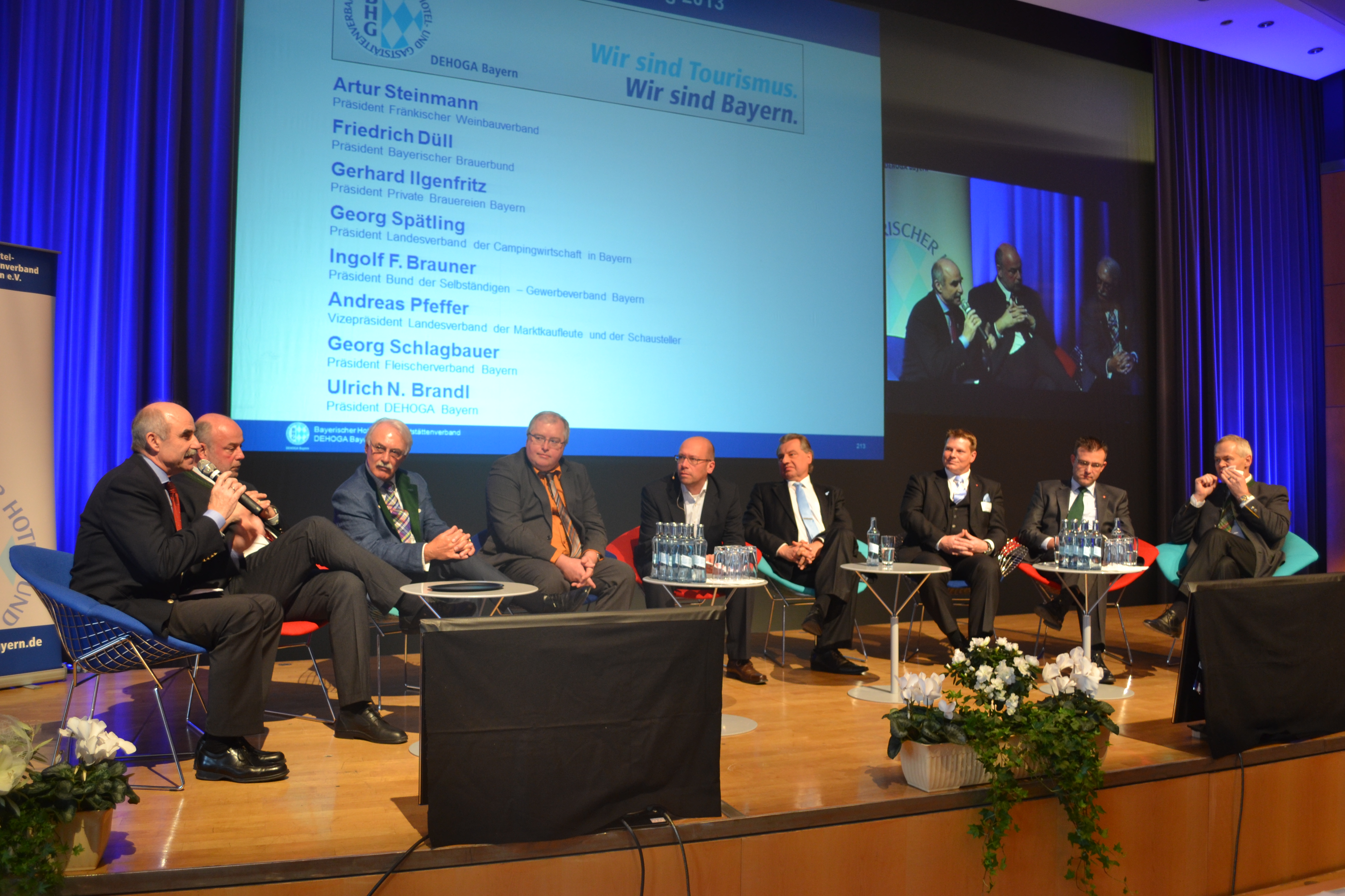 Unter dem Motto „Wir sind Tourismus. Wir sind Bayern“ stand am zweiten Tag die hochkarätig besetzte Podiumsdiskussion über die Rahmenbedingungen für den Tourismus in Bayern. Mit Ulrich N. Brandl diskutierten alle Präsidenten von Verbänden, die sich in den vergangenen Monaten bei gemeinsamen Pressekonferenzen für den Tourismus im Freistaat eingesetzt hatten. Dazu gehörten Artur Steinmann, Präsident des fränkischen Weinbauverbandes, Friedrich Düll, Präsident des Bayerischen Brauerbundes, Gerhard Ilgenfritz, Präsident des Verbandes der privaten Brauereien, Georg Spätling, Präsident des Landesverbandes der Campingwirtschaft in Bayern, Ingolf F. Brauner, Präsident des Bundes der Selbstständigen, Andreas Pfeffer, Vizepräsident des Landesverbandes der Marktkaufleute und Schausteller sowie Georg Schlagbauer, Präsident des Fleischerverbandes Bayern. Inhaltlich ging es insbesondere darum, die vielfältigen Auswirkungen des Tourismus aufzuzeigen und seine Bedeutung zu unterstreichen. Denn: Vom Tourismus in Bayern profitieren nicht nur Hotellerie und Gastronomie, sondern viele andere Branchen. Dafür seien, so die einhellige Forderung der Präsidenten an die Politik, optimale Rahmenbedingungen nötig.
