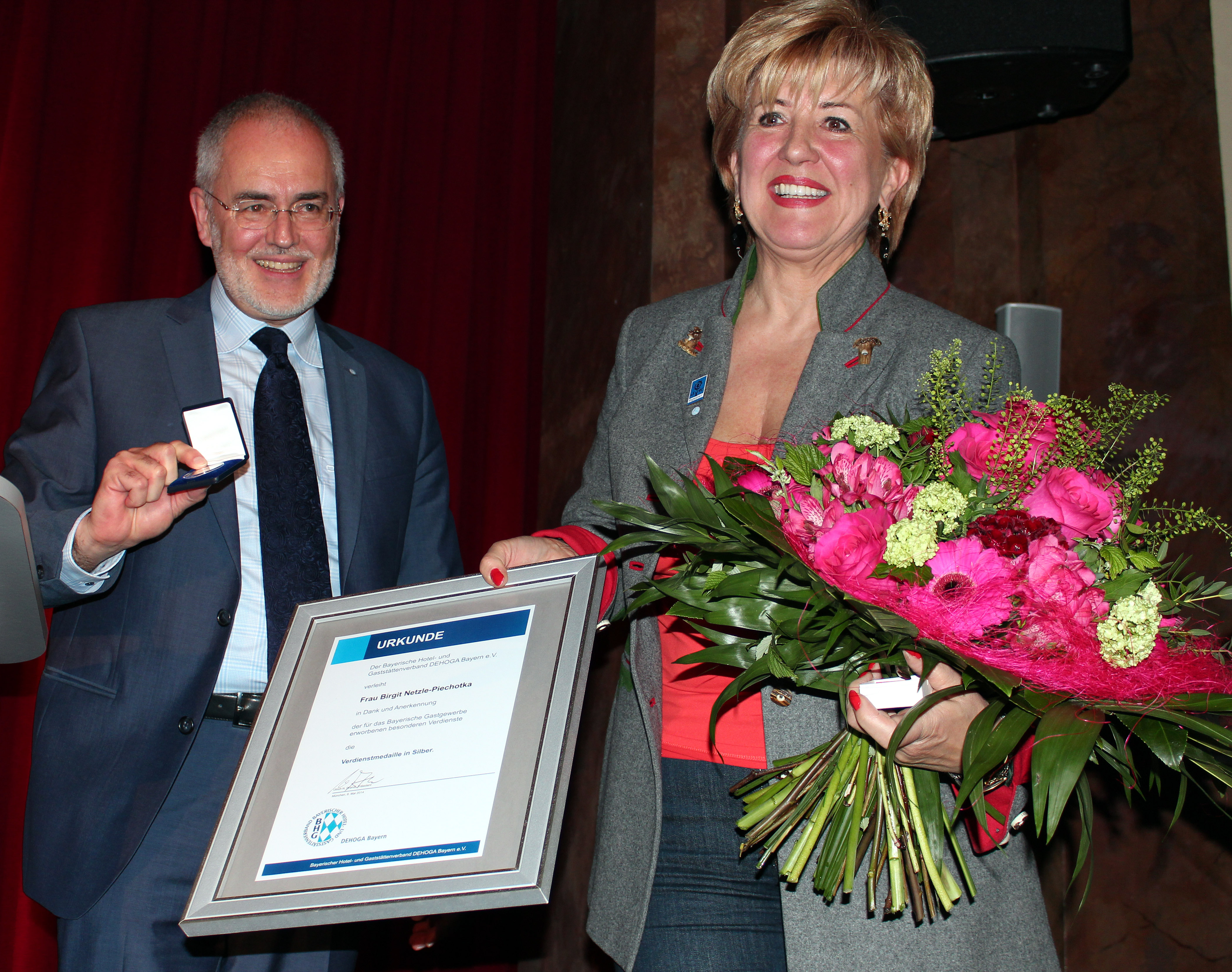 Birgit Netzle-Piechotka (Asam Schlössl, seit 15 Jahren Stellvertretende Vorsitzende) und Anton Winklhofer (Ratskeller, seit 2001 Kassier des Verbandes) stellten sich aus persönlichen Gründen nicht wieder zur Wahl. Mayer bedankte sich bei beiden sehr herzlich für die langjährige und erfolgreiche ehrenamtliche Arbeit und zeichnete sie, zusammen mit Claudia Heim, Geschäftsführerin des DEHOGA Bayern, mit der Verdienstmedaille und Ehrennadel in Silber aus.