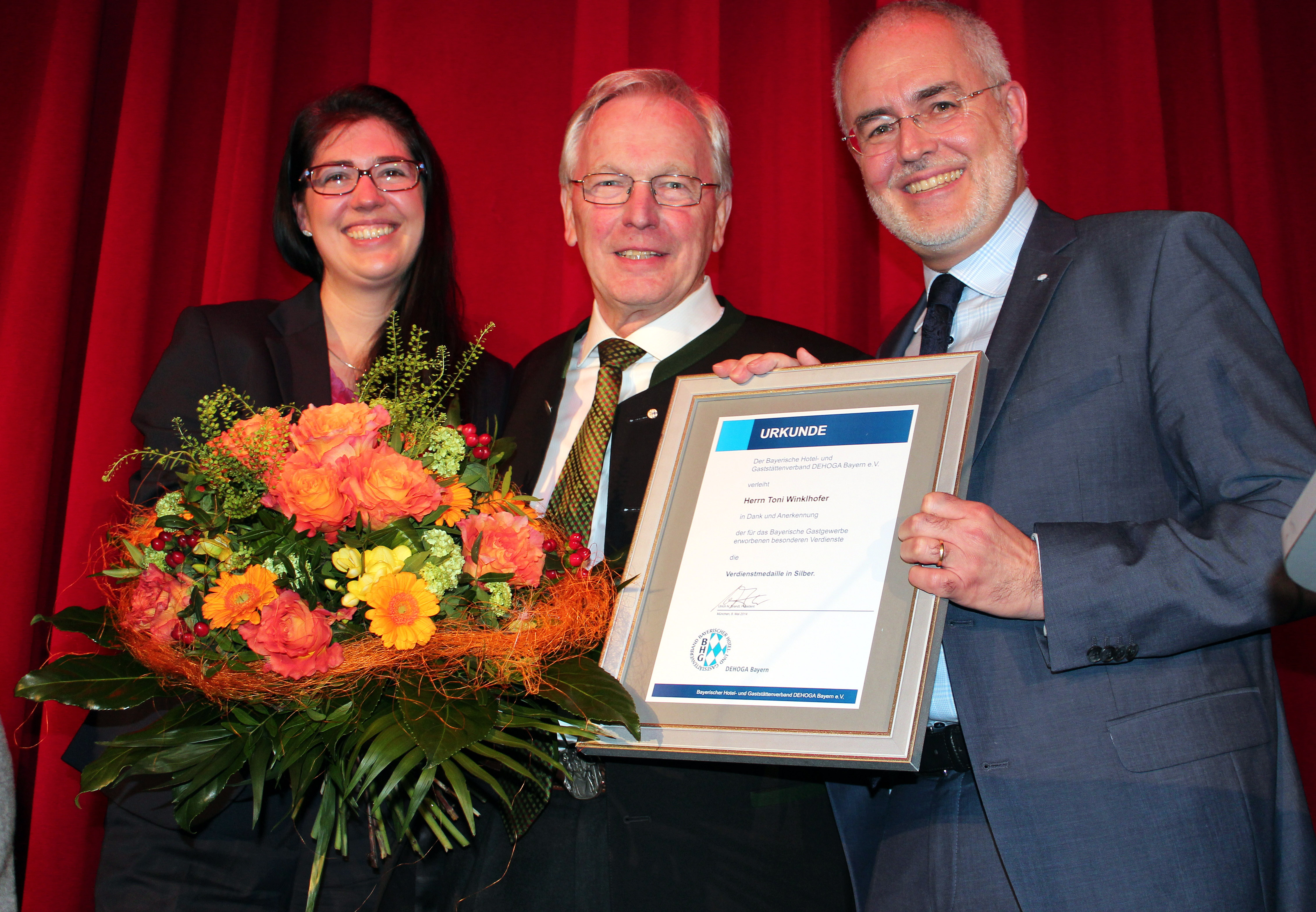BU PE DEHOGA Bayern München Wahlen 2014 (Foto 2): Ehrung von Anton Winklhofer (2.v.l.) mit der Verdienstmedaille und Ehrennadel in Silber durch den Kreisvorsitzenden, Dipl.-Kfm. Conrad Mayer (r.) und der stellvertretenden Bezirksgeschäftsführerin Katharina Freund.