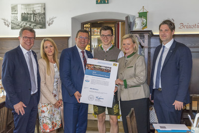 BU: Wirtschafts- und Tourismusminister Pschierer überreicht Förderbescheid für Kampagne „Zukunft für das bayerische Gastgewerbe“ an DEHOGA Bayern (v. l.): Klaus Stöttner, tourismuspolitischer Sprecher CSU, Isabella Hren, Geschäftsführerin der Bayern Tourist GmbH BTG, Bayerns Wirtschafts- und Tourismusminister Franz Josef Pschierer, Korbinian Vogl, Pächter des Flötzinger Bräustüberls, Angela Inselkammer, Präsidentin des Bayerischen Hotel- und Gaststättenverbandes DEHOGA Bayern, sowie Dr. Thomas Geppert, Landesgeschäftsführer DEHOGA Bayern.