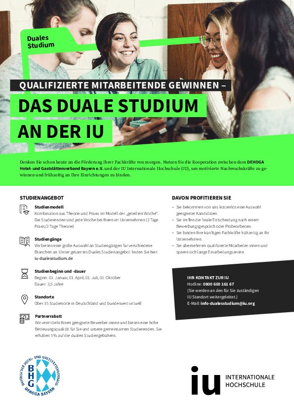 Dr. Thomas Geppert, DEHOGA Bayern-Landesgeschäftsführer: „Um unser unterstützendes Angebot im Bereich der Berufsausbildung für unsere Mitgliedsbetriebe zu erweitern, kooperieren wir mit der IU Internationalen Hochschule. Schließlich gibt es einen nicht unbeachtlichen Teil von Jugendlichen, die sich für das Gastgewerbe interessieren und gleichzeitig einen akademischen Abschluss absolvieren möchten. Das für die Bedürfnisse der Studierenden und der Betriebe passgenaue Angebot spricht für die IU als anerkannte und moderne Hochschule“, erläutert er und fügt hinzu: „Wir erwarten, dass der Großteil der Ausbildungen weiterhin in der klassischen dualen Berufsausbildung erfolgen wird, auch hier wurden erst mit dem Beginn des vorangegangenen Ausbildungsjahres neue Ausbildungsberufe geschaffen. Mit dem neuen zusätzlichen Angebot finden wir jedoch eine vielversprechende Ergänzung.“ Die Zusammenarbeit umfasst neben der Rabattierung der Studiengebühren, der gemeinsamen Schaltung von Stellenanzeigen, Veranstaltungen und Exkursionen auch die Einbindung von Mitarbeitenden der Mitgliedsbetriebe in die Lehre, beispielsweise durch Fachvorträge Expertengespräche oder auch als Honorardozenten.